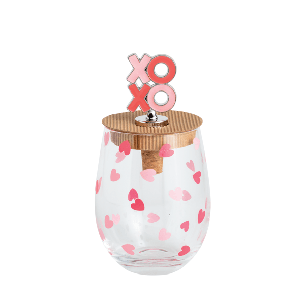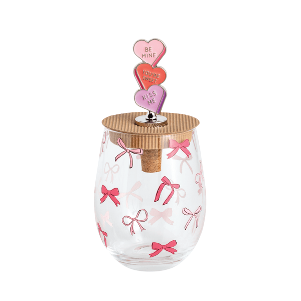 Bow Valentine Wine Glass Set is a charming 2-piece collection perfect for celebrating love and special occasions. Each stemless wine glass features a delightful patterned design, adding a touch of elegance to your drinkware collection. The set includes a beautifully crafted metal bottle stopper, adorned with an enamel icon topper, ensuring your wine stays fresh and stylishly sealed. The glasses have a generous 16 oz capacity, ideal for enjoying your favorite wines, while the stopper measures 5" x 1", making it a perfect fit for most bottles. Elevate your dining experience with this exquisite set, perfect for gifting or personal use.