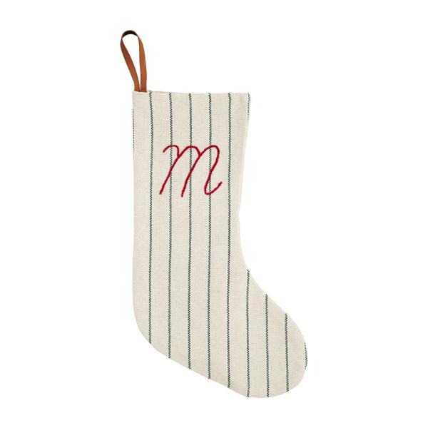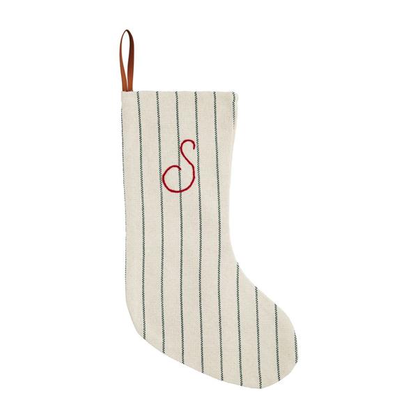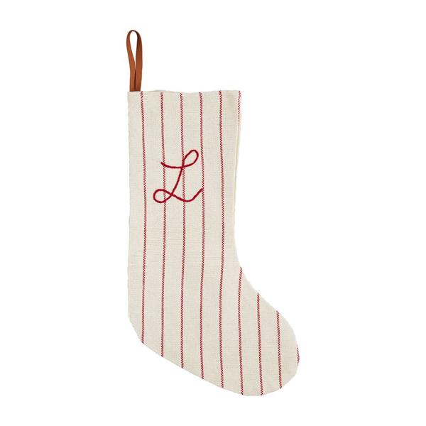 This Product Listing is for the Letter G. Make your holidays even more special with this personal Initial stocking. The woven cotton stocking features an initial embroidery. The stocking features a red and cream stripe pattern, with a red initial. The stocking also features a red strap for hanging these stockings by the fire!
