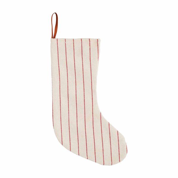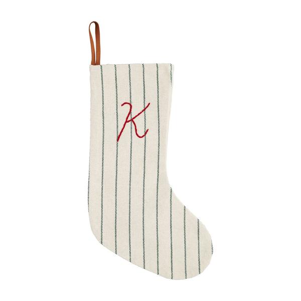 Make your holidays even more special with this personal T Initial stocking. The woven cotton stocking features an initial embroidery. The stocking features a red and cream stripe pattern, with a red initial. The stocking also features a red strap for hanging these stockings by the fire!