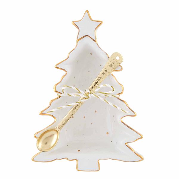 Hand-painted stoneware gold ornament dip bowl arrives tied with brass plated spoon.