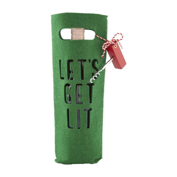 Let's get lit with this Ho Ho wine bag set. The two piece set comes with a die-cut felt wine bag. The wine bag features a red coloring. The center of the wine bag reads "Ho Ho Whole bottle". The set comes with a wood and metal corkscrew that is tied to the top of the wine bag with a ribbon.
